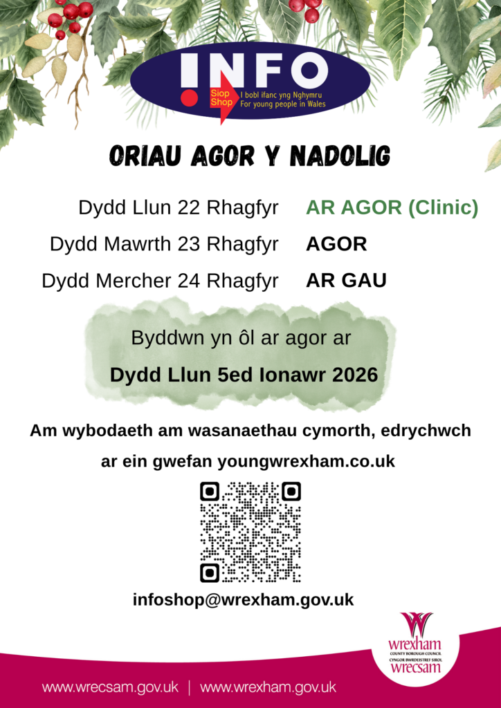 Bydd Siop INFO ar agor hyd at ac yn cynnwys dydd Mawrth 23 Rhagfyr (11:30am tan 4:30pm). Yna byddwn ar gau tan ddydd Llun 5 Ionawr 2026. Os oes angen i chi alw heibio am unrhyw bethau munud olaf, condomau am ddim dros y tymor partïon, sgwrs â rhywun o In2change am unrhyw gymorth cyffuriau neu alcohol, neu efallai eich bod chi eisiau siarad â rhywun o un o’r nifer o dimau sydd wedi’u lleoli yn INFO – Byddwn ni i gyd yno tan 4:30pm ar y 23ain (Noswyl Nadolig)!